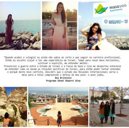 Quando acabei o colegial, diferente da grande maioria dos meus amigos, eu ainda não sabia ao certo o que seguir na carreira profissional. Não me sentia segura das matérias que eu havia escolhido para prestar no vestibular, mas me sentia na obrigação de entrar numa faculdade, pois era o que todos faziam quando acabavam o colégio. Depois de muita conversa com meus pais, decidimos juntos que eu não precisava seguir o mesmo caminho no qual todos seguiam. Era sabido que eu não estava pronta, ainda não. No final do terceiro colegial, a escola nos apresentou o Programa Masa, que organiza viagens com a duração de 10 meses pra Israel. Sem pensar duas vezes, fui saber mais detalhes do programa e se eu me encaixaria nele. Dentre todas as escolhas que eu poderia fazer no final daquele ano, eu escolhi viajar. Escolhi ter o meu ano “sabático”. Ano em que eu seria dona do meu tempo, sem ninguém me dizendo o que precisava ser feito. Tempo para rever meus horizontes, cultivar o espírito, me entender melhor. Segura de minha decisão, fui passar os melhores dez meses, até agora, da minha vida em Israel, no programa Shnat da Shaarei Biná, uma casa de brasileiras. Impossível resumir aqui o que esse ano significou pra mim. Aprendi muito, com as pessoas, com as situações. Vi o quanto eu tinha uma ideia errada sobre Israel, sobre a religião, sobre as religiões. Pude ver a tamanha diversidade que existe num mesmo lugar, com tantas culturas e idiomas. Tive também o privilégio de presenciar a guerra entre o Estado de Israel e a Faixa de Gaza. Momento tenso, mas de muito aprendizado. Por dentro de mim, uma guerra também havia se iniciado: precisava entender como se davam as relações políticas de Israel, para então poder tentar entender o porquê deste novo conflito. Após muitas reflexões fui signatária de uma resolução de paz interior “de mim para comigo mesma”. Descobri que, o estudo das Relações Internacionais seria o meio para a total compreensão e defesa de meu povo: o povo judeu. Pronto, no final do ano, eu estava com os meus objetivos cumpridos. Conheci muita coisa nova, inclusive uma Ana que eu não conhecia. Uma Ana sionista, interessada em ajudar o próximo e alimentada espiritualmente através da religião. Sem dúvidas, esses dez meses foram necessários para ajudar a construir pilares para o que me aguarda no futuro. Futuro que por sua vez, será construído se D’us quiser, em Israel. Agora me sinto pronta. Agradeço a oportunidade, e espero que muitos possam fazer o que eu fiz. Ana Brinstein. Programa Shnat Shaarei Bina.